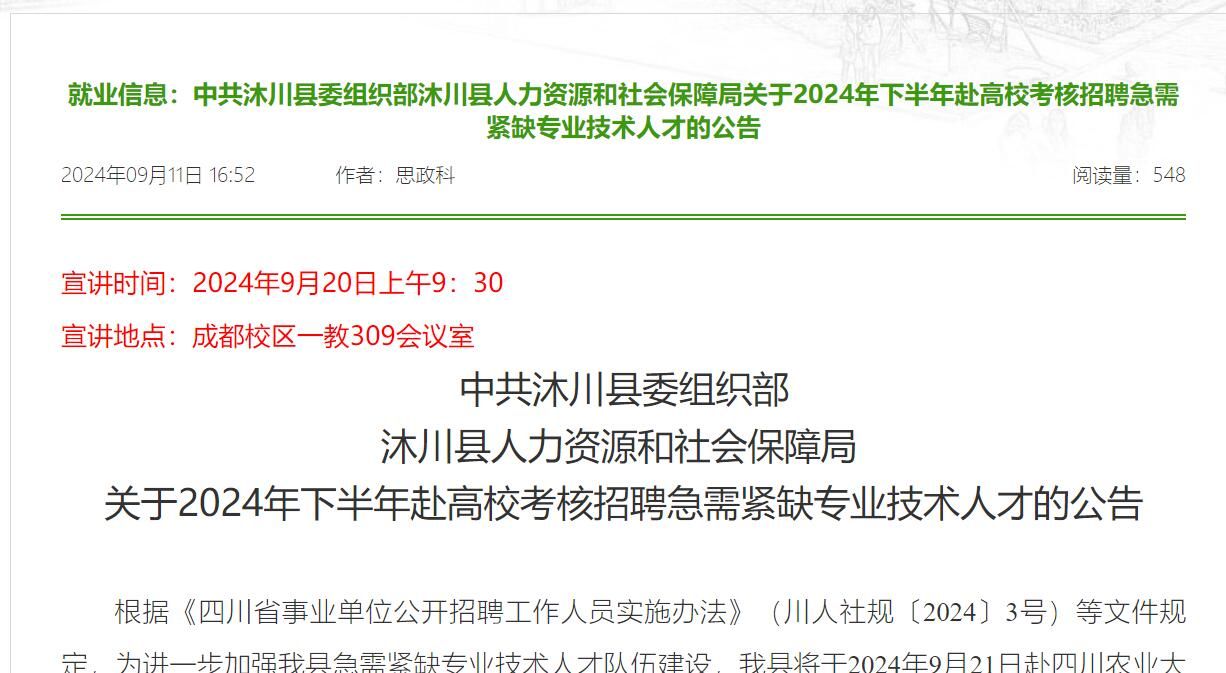 【事业单位】中共沐川县委组织部沐川县人力资源和社会保障局关于2024年下半年赴高校考核招聘急需紧缺专业技术人才的公告