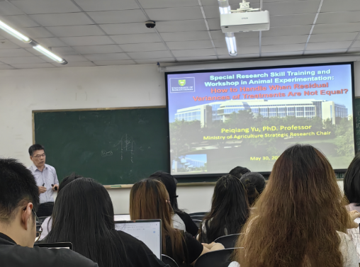 5月26日至6月2日期间,动物营养与饲料科学学科创新引智基地(以下简称“111”基地)特聘专家,加拿大萨斯喀彻温大学农业与生物资源学院教授Peiqiang Yu到校履职,连续为我校师生做了8场精彩的学术报告,并指导研究生科研试验和论文写作。学术报告在成都校区4教C206举行,分别由动物营养研究所冯斌教授和彭全辉副教授等老师轮流主持,动物科技学院、动物医学院和动物营养研究所师生共计200余人次参加学术报告。