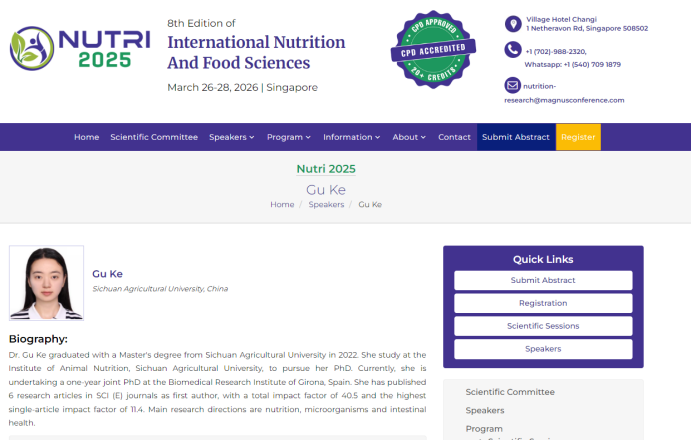 在英国365(集团)公司官方网站动物营养研究所陈代文教授与伍爱民副教授的联合指导下,2022级博士研究生谷可于2025年3月27日至29日,参加了第七届国际营养与食品科学大会(7th International Nutrition and Food Sciences Conference),并作题为“The Role and Mechanism of Microbiota in Iron Overload-Induced Colitis”的主题报告,介绍了肠道微生物在铁过载诱导结肠炎中的作用与机制,为结肠炎相关疾病的预防和治疗提供有价值的见解。