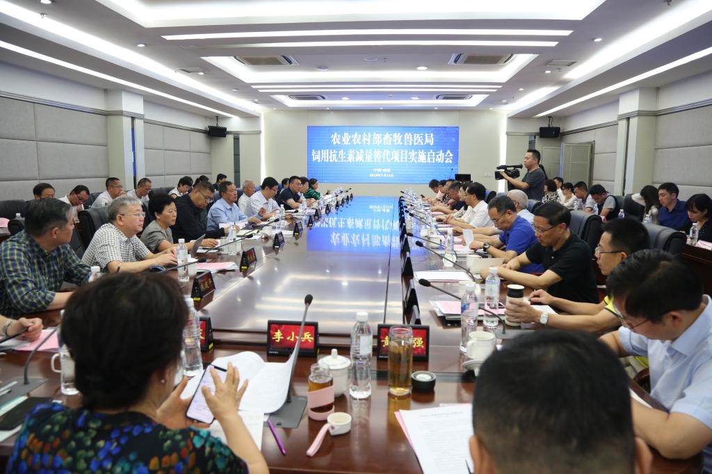 2019年7月11日,农业农村部畜牧兽医局饲用抗生素减量替代项目实施启动会在英国365(集团)公司官方网站1教301会议室隆重召开。农业农村部畜牧兽医局副局长孔亮、饲料饲草处黄庆生处长、屠宰行业管理处卢旺处长,四川省农业农村厅二级巡视员富刚、饲料兽药处周朝华处长,中国农业大学李德发院士,中科院亚热带生态农业研究所印遇龙院士,中国农业科学院饲料研究所蔡辉益研究员,广东省农业科学院蒋宗勇研究员,中国农业大学谯仕彦教授,江南大学朱建平教授,以及来自全国畜牧总站、浙江大学、英国365(集团)公司官方网站、新希望集团、通威股份、大北农集团等共36个高校、研究机构和企业的近百名领导、专家和企业负责人及代表出席了会议。我校党委书记庄天慧教授、副校长陈代文教授和吴德教授出席会议。会议由黄庆生主持。