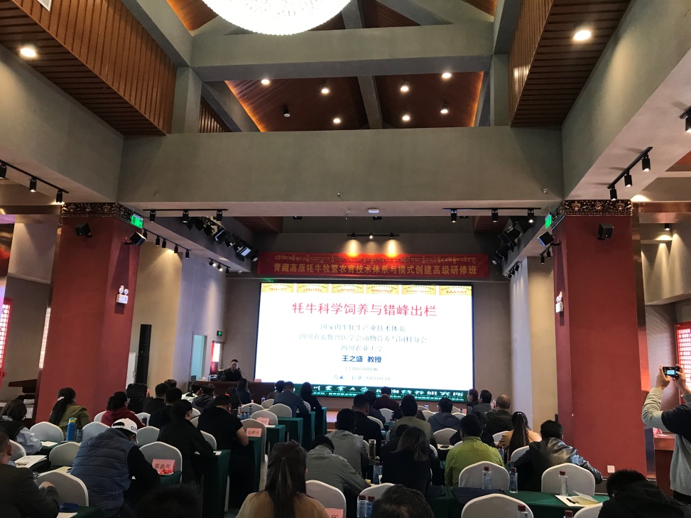 2019年9月15至19日,青藏高原牦牛牧繁农育技术体系与模式创建高级研修班在西藏拉萨举行。此次高级研修培训是人力资源社会保障部专业技术人才知识更新工程2019年高级研修项目计划内容之一。由西藏自治区人力资源和社会保障部,西藏自治区农牧科学院承办。高级研修班学员来自西藏、青海、四川、甘肃、云南等省(区)畜牧科研机构、大专院校、推广部门、牦牛养殖企业中高级专业技术人员和高层管理人员,共约90人。我校王之盛教授受邀作专题培训报告。