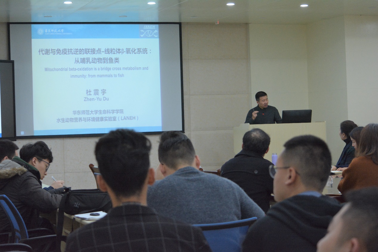 杜震宇教授的报告讲述了哺乳动物线粒体脂肪酸-β氧化与鱼类的异同,指出线粒体脂肪酸-β氧化是连接哺乳动物和鱼类生理代谢与免疫抗逆的重要桥梁。张美玲教授的报告讲述了环境因子(如盐、抗生素、环境雌激素等)对动物肠道微生物的影响,肠道微生物与宿主脂质代谢的关系,揭示了鱼类肠道微生物与机体健康的关系。