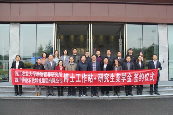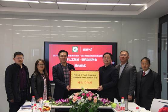 会上,四川特驱农牧科技有限公司技术总监梅绍锋与动物营养研究所所长余冰共同签订了共建博士工作站和设立“特驱动物营养研究生奖学金”的协议,陈代文和杜江平为博士工作站揭牌。