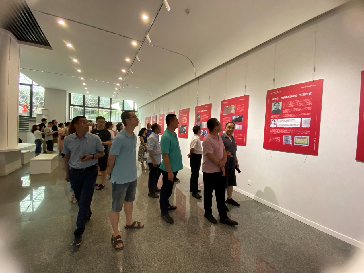 展览内容聚焦近百年川农人在党领导下的奋斗历程:寻路、救亡、忠诚、归来、攻坚和奋斗。在本次展览中,师生们看到了王右木、郑佑之、康明惠等川农人在黑暗中举火,宣传马克思主义,启发农民觉悟,培育革命力量,以积极寻求救国出路;看到在八年抗战时,杨开渠、王绍虞、颜济等川农人紧守“民族复兴最后的根据地”,种植双季稻为全国填补粮食缺口,或慨然从军,保家卫国;看到江竹筠在面对军统特务的严刑拷打下的“以建设新中国为志,为共产主义革命事业奋斗到底”的毅然,黄宁康、胡启恩等川农人在解放西南、迎接彻底解放的斗争中的忠诚;看到了“为中华崛起而学农”的杨凤、“难忘最是故土情”的邱祥聘等一代代川农人不断响应祖国的召唤,建设祖国农业的执着,铸成了“85%回国率”的奇迹;看到了脱贫攻坚期间川农大把论文写在大地上、把成果带进百姓家的使命感;看到了在党的全面领导和学校党委的带领下,川农大取得的各种辉煌成就。