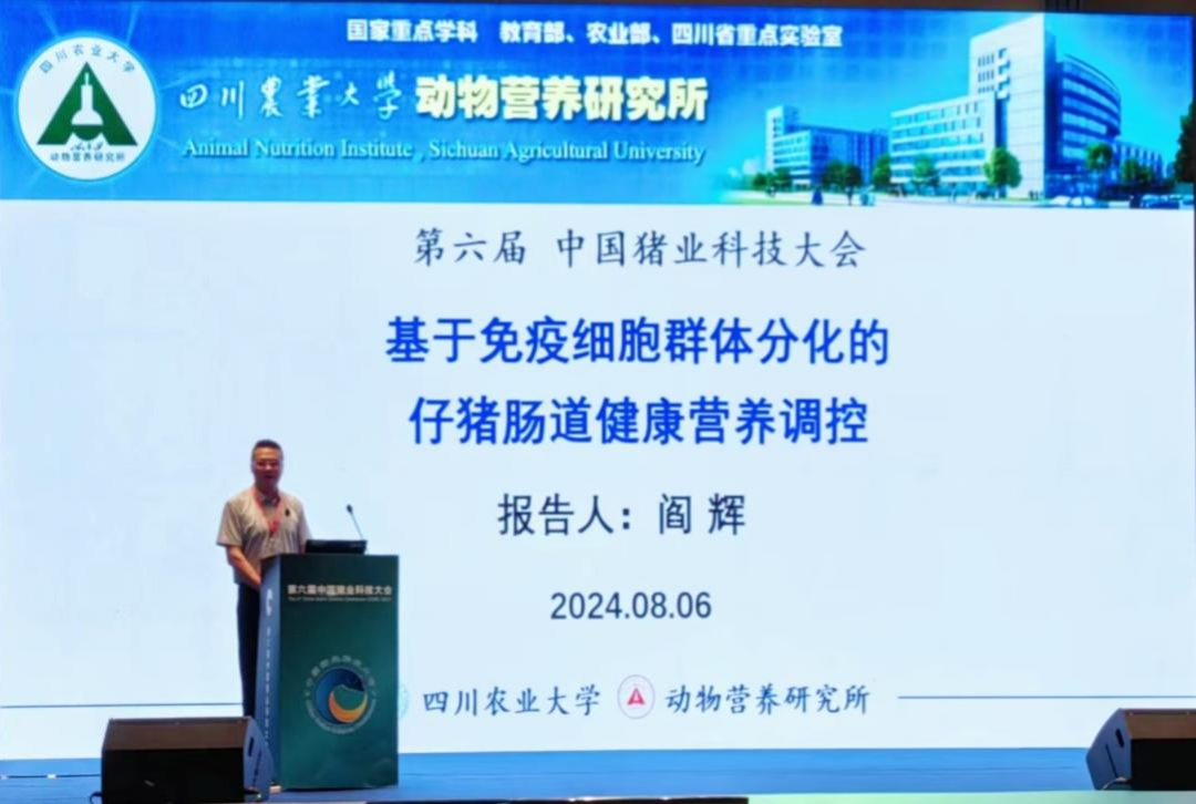 会议期间,动物营养研究所副所长车炼强教授、阎辉副教授携五位四川省产教融合项目专项资助研究生参会并积极参与大会各项活动。车炼强教授受邀主持“营养与饲料”专题会议,与专家们进行深入互动。阎辉副教授在会议上作了题为《基于免疫细胞群体分化的仔猪肠道健康营养调控》的学术报告。报告深入分析免疫稳态对保障生猪健康养殖和高效生产的重要性,强调仔猪早期免疫发育对提高动物抗病能力、生长发育的必要性,并提供仔猪健康免疫关键参数,报告内容丰富,数据详实,赢得了与会者的广泛关注和积极讨论。会后,车炼强教授、阎辉组织学生开展会议讨论,深入分析了当前生猪产业在科技创新方面的挑战与机遇,学术交流深入务实。