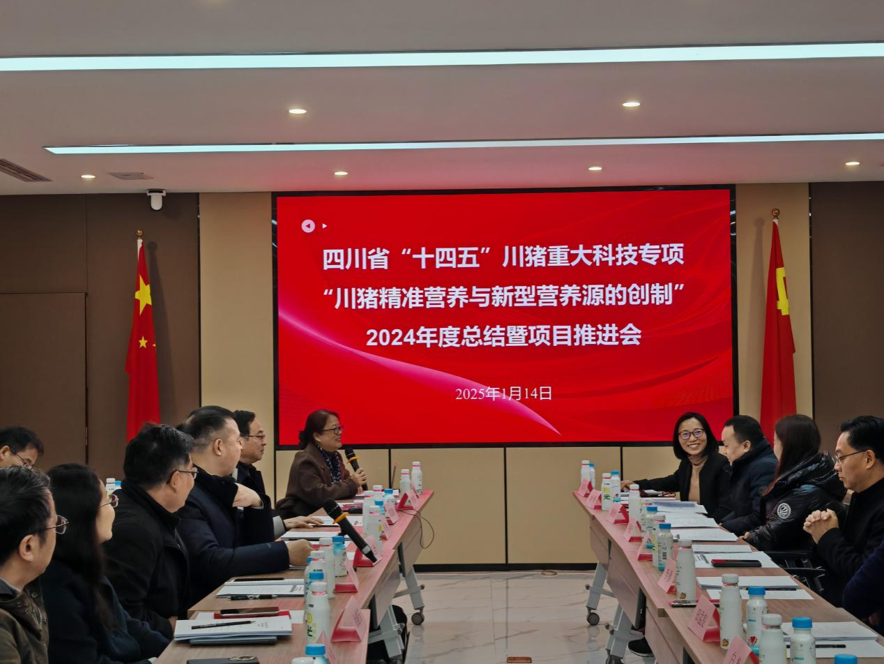 2025年1月14日上午,由我校动物营养研究所郑萍教授主持的四川省“十四五”川猪重大科技专项“川猪精准营养与非粮型营养源创制”2024年度总结暨项目推进会在成都市新希望六和股份有限公司顺利召开。四川省科学技术厅资源配置处夏雨,项目专家委员会组长陈代文教授、西南民族大学黄艳玲教授、四川省畜牧总站刘一辉高级畜牧师、英国365(集团)公司官方网站科技处处长田孟良、英国365(集团)公司官方网站财务处处长白梅等莅临会议指导,会议由动物营养研究所余冰教授主持。