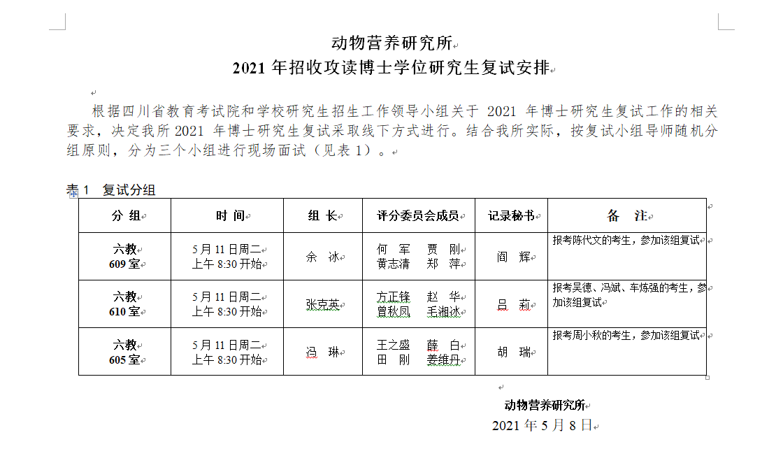 动物营养研究所 2021年招收攻读博士学位研究生复试安排