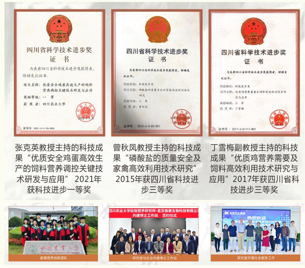 科学研究:家禽营养与饲料研究室承担国家级项目、省部级项目和横向合作项目200余项,其中主持国家自然科学基金12项,科技部科技支撑项目1项,四川省蛋鸡、肉鸡、肉鸭现代产业链关键技术研究集成与产业化示范项目3项,参与国家重点研发项目、四川省科技支撑计划项目等40余项。获四川省科技进步一等奖1项,二等奖1项,三等奖2项。近五年来,发表学术论文120余篇,其中SCI收录论文96篇,授权发明专利10件,软件著作权1件。