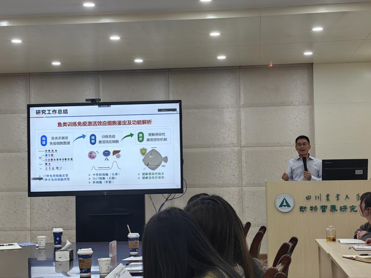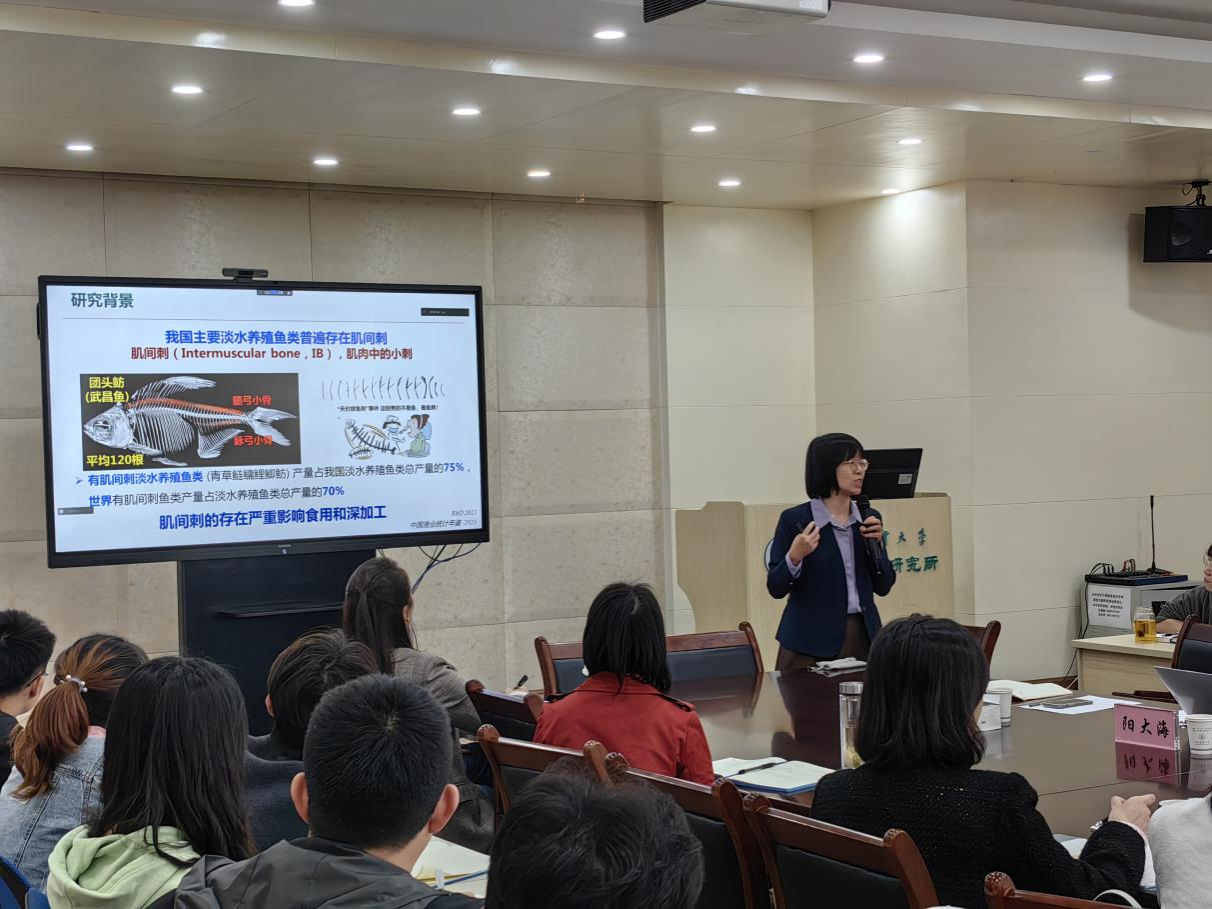 会议期间,高泽霞教授提出了“我国主养大宗鱼类普遍存在肌间刺,有刺淡水鱼类产量占到我国淡水鱼类总产量76%以上,影响消费者的食用和水产品深加工,因此鱼类肌间刺性状遗传改良对于推动水产养殖发展意义显著。”同时,从鱼类肌间刺发生发育系统进化、骨化规律、分子调控机制等方面系统讲解了团队研究,并强调了团头鲂肌间刺性状的遗传改良研究。接着,阳大海教授系统讲解了以海水养殖鱼种大菱鲆为研究模型,报告提到构建了迄今为止种类最丰富的硬骨鱼类免疫细胞谱图,初步明确了鱼类训练免疫激活关键效应细胞类型,并解析了鱼类训练免疫激活缓解感染性肝损伤和肠炎发生分子机制。最后,参会老师和学生与两位专家就报告内容进行了深入的交流和探讨,为今后的研究奠定了一定思路。